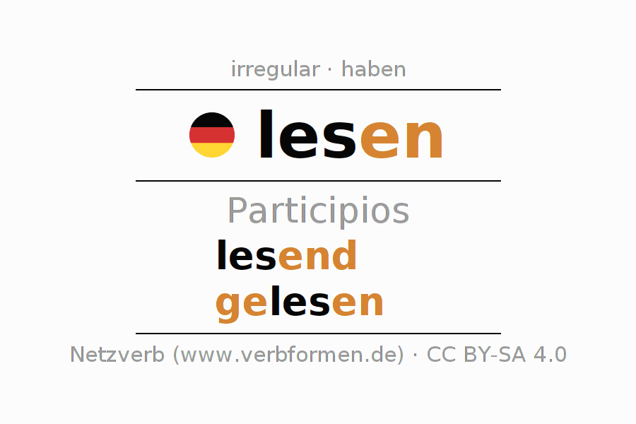 El verbo lesen, conjugado completamente en todas las personas y números gramaticales en Participio Presente Pasado perfecto.