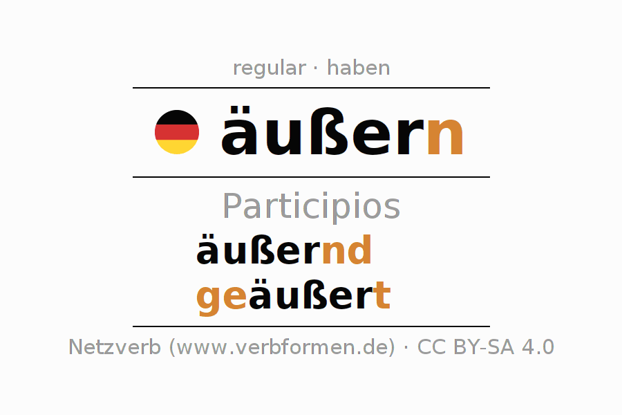 El verbo äußern, conjugado completamente en todas las personas y números gramaticales en Participio Presente Pasado perfecto.