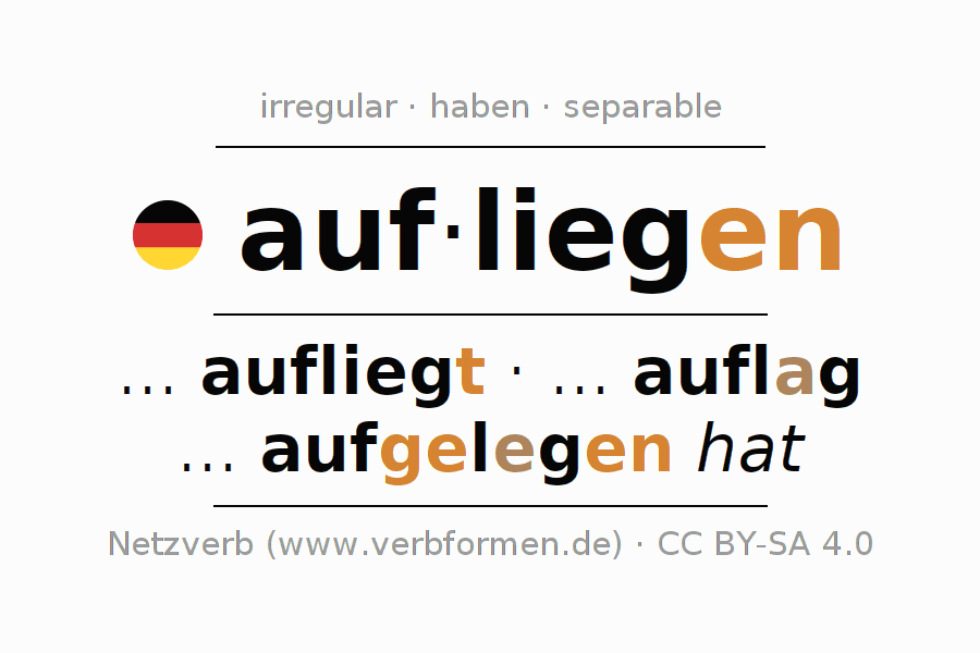 El verbo aufliegen (hat), conjugado completamente en todas las personas y números gramaticales en Participio Presente Pasado perfecto.