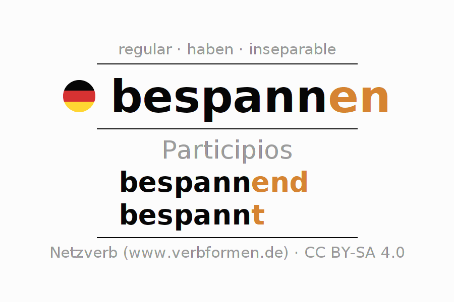 El verbo bespannen, conjugado completamente en todas las personas y números gramaticales en Participio Presente Pasado perfecto.