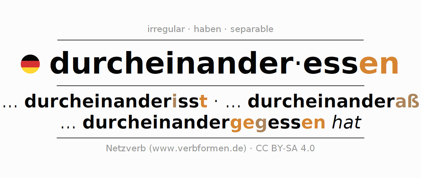 El verbo durcheinanderessen, conjugado completamente en todas las personas y números gramaticales en Participio Presente Pasado perfecto.