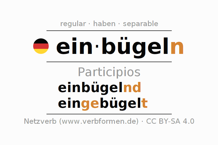 El verbo einbügeln, conjugado completamente en todas las personas y números gramaticales en Participio Presente Pasado perfecto.