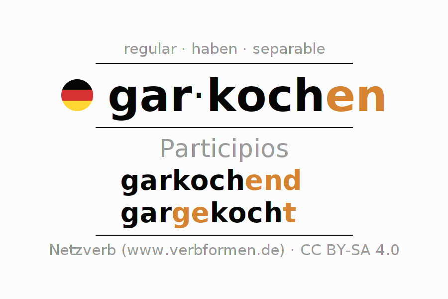 El verbo garkochen, conjugado completamente en todas las personas y números gramaticales en Participio Presente Pasado perfecto.