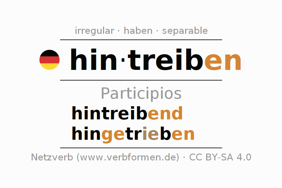 El verbo hintreiben (hat), conjugado completamente en todas las personas y números gramaticales en Participio Presente Pasado perfecto.