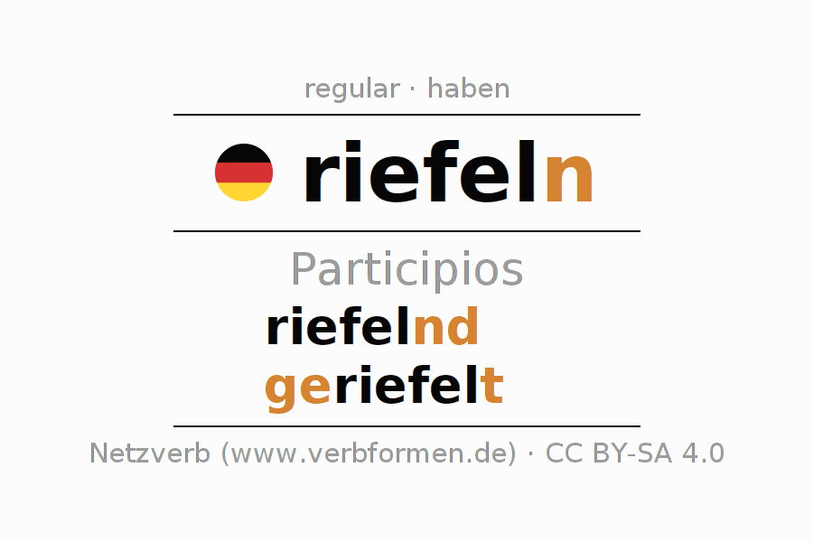 El verbo riefeln, conjugado completamente en todas las personas y números gramaticales en Participio Presente Pasado perfecto.