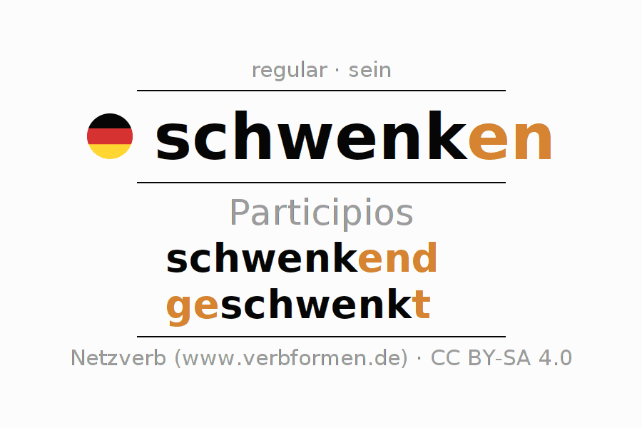 La conjugación de schwenken en Participio Presente Pasado perfecto palabra del habla Activo es schwenkend, geschwenkt.Para construir esta formas se requiere seguir algunas reglas gramaticales y también las especificaciones para la conjugación de verbos simples de schwenken en Participio . Comentarios ☆