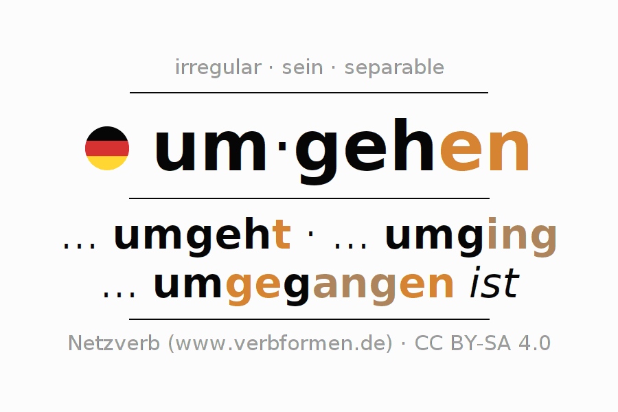 El verbo um-gehen (ist), conjugado completamente en todas las personas y números gramaticales en Participio Presente Pasado perfecto.