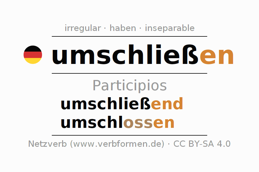 El verbo umschließen, conjugado completamente en todas las personas y números gramaticales en Participio Presente Pasado perfecto.