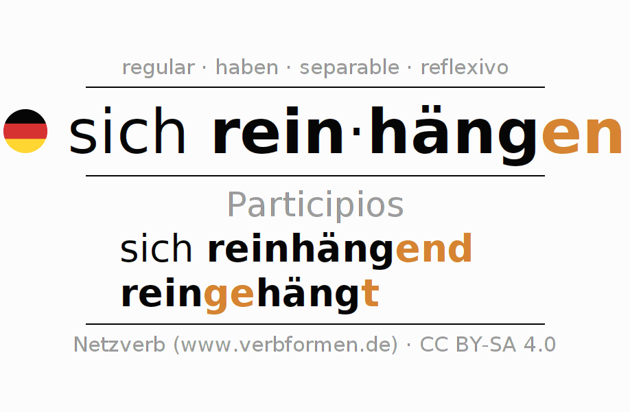 El verbo sich reinhängen, conjugado completamente en todas las personas y números gramaticales en Participio Presente Pasado perfecto.