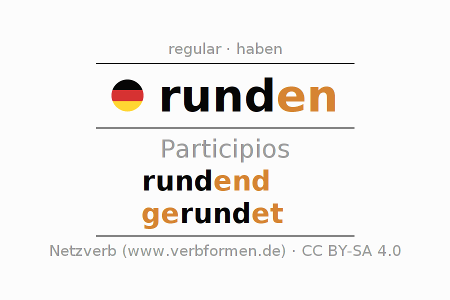 El verbo runden, conjugado completamente en todas las personas y números gramaticales en Participio Presente Pasado perfecto.
