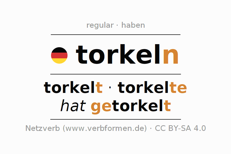 El verbo torkeln (hat), conjugado completamente en todas las personas y números gramaticales en Participio Presente Pasado perfecto.