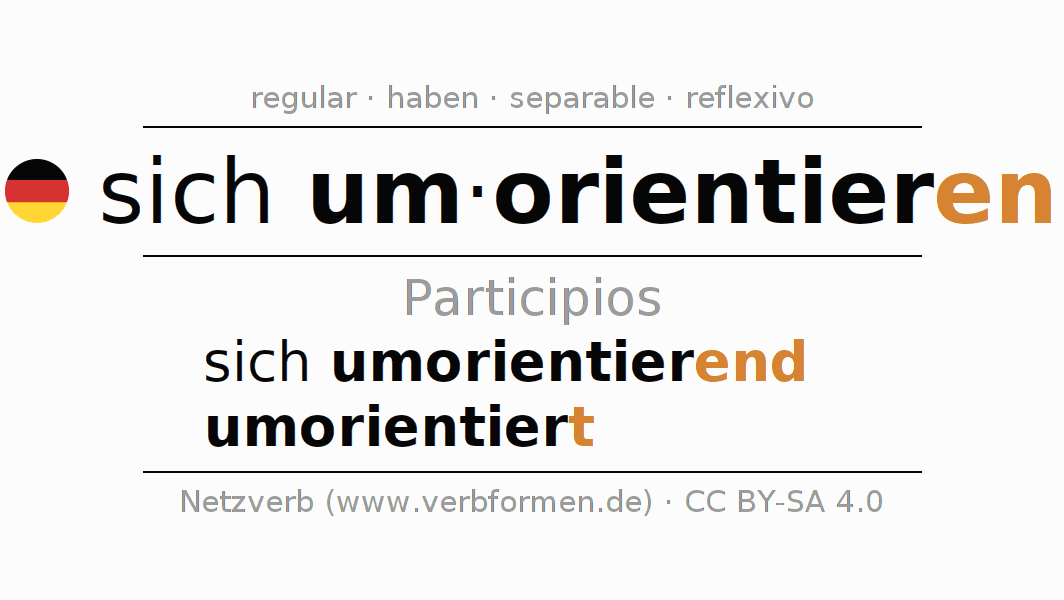 Los participios de sich umorientieren (reorientar, ajustar) son: sich umorientierend, umorientiert