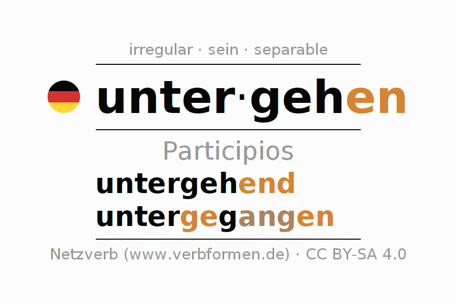 El verbo untergehen, conjugado completamente en todas las personas y números gramaticales en Participio Presente Pasado perfecto.