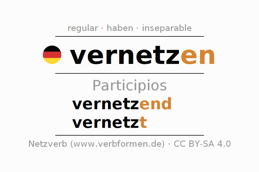 El verbo vernetzen, conjugado completamente en todas las personas y números gramaticales en Participio Presente Pasado perfecto.