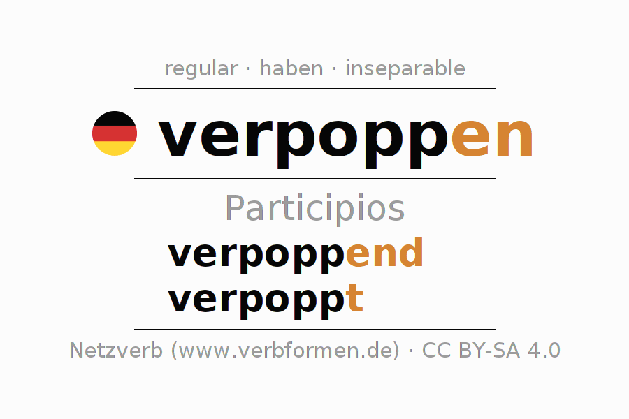 El verbo verpoppen, conjugado completamente en todas las personas y números gramaticales en Participio Presente Pasado perfecto.