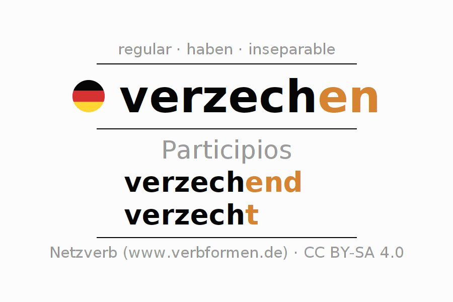 El verbo verzechen, conjugado completamente en todas las personas y números gramaticales en Participio Presente Pasado perfecto.