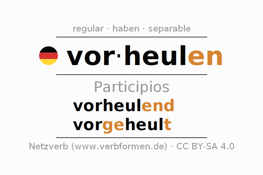 El verbo vorheulen, conjugado completamente en todas las personas y números gramaticales en Participio Presente Pasado perfecto.