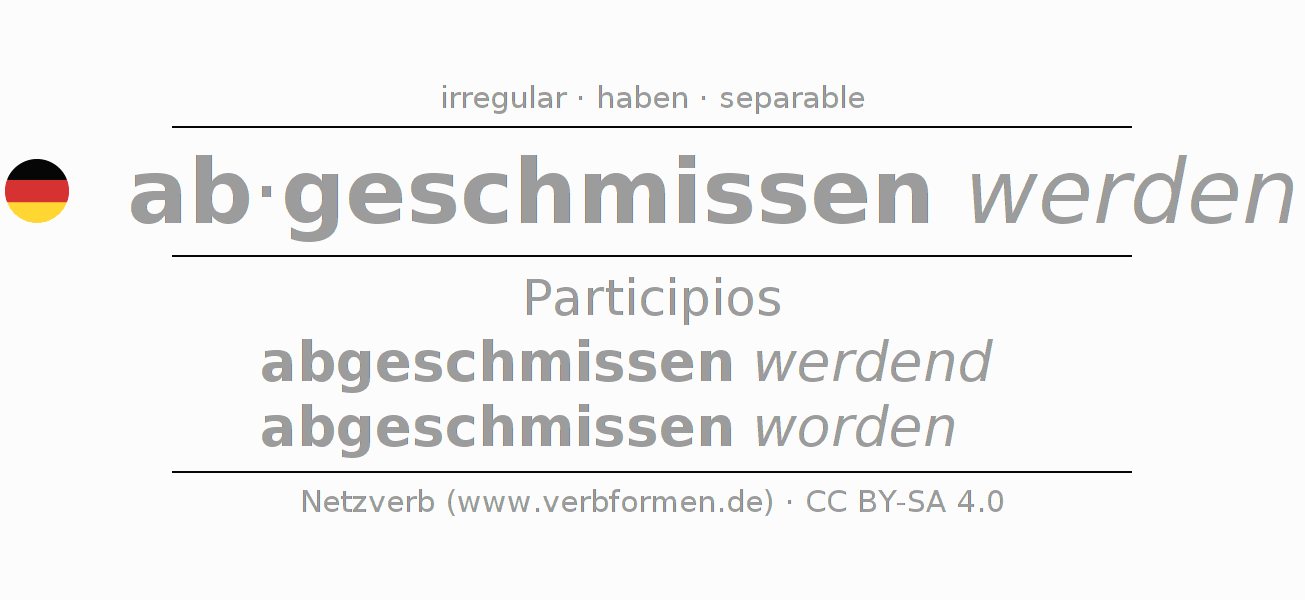 El verbo abschmeißen, conjugado completamente en todas las personas y números gramaticales en Participio Presente Pasado perfecto.