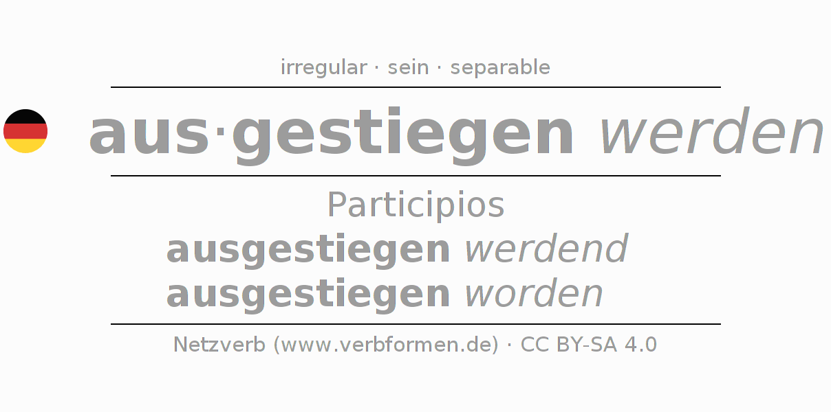 La conjugación de aussteigen en Participio Presente Pasado perfecto palabra del habla Pasivo procesivo es ausgestiegen werdend, ausgestiegen worden.Para construir esta formas se requiere seguir algunas reglas gramaticales y también las especificaciones para la conjugación de verbos simples de aussteigen en Participio . Comentarios ☆