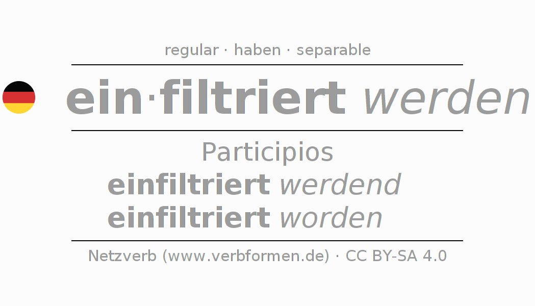 El verbo einfiltrieren, conjugado completamente en todas las personas y números gramaticales en Participio Presente Pasado perfecto.