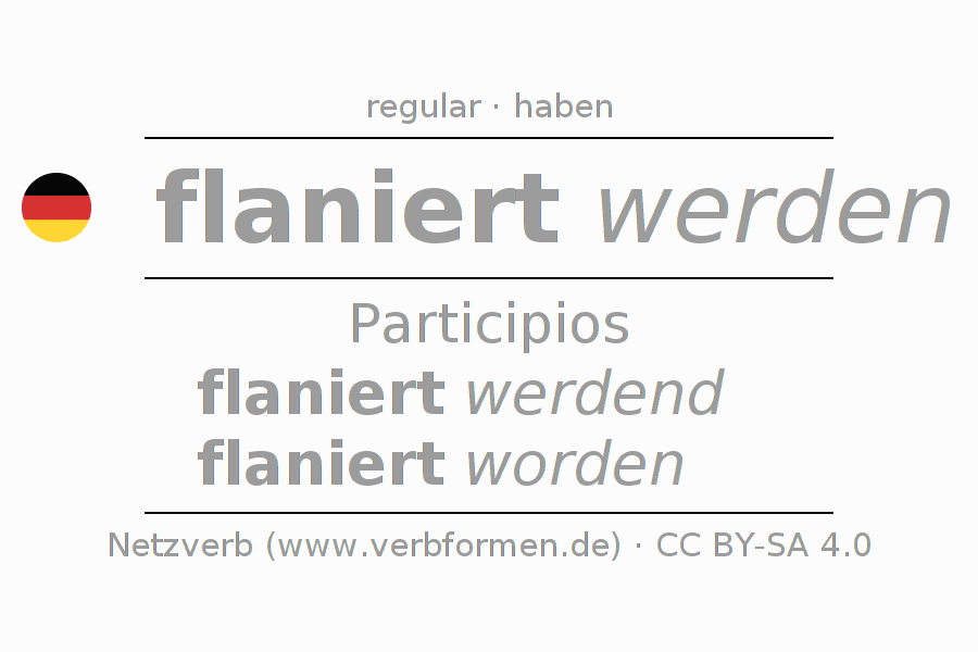El verbo flanieren (hat), conjugado completamente en todas las personas y números gramaticales en Participio Presente Pasado perfecto.