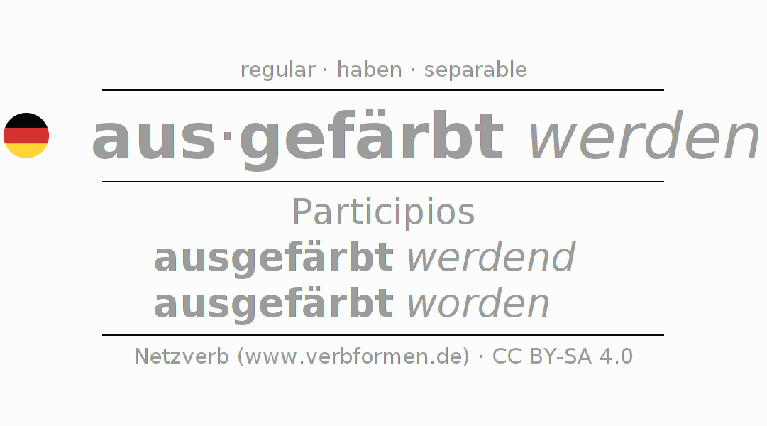 El verbo ausfärben (hat), conjugado completamente en todas las personas y números gramaticales en Participio Presente Pasado perfecto.
