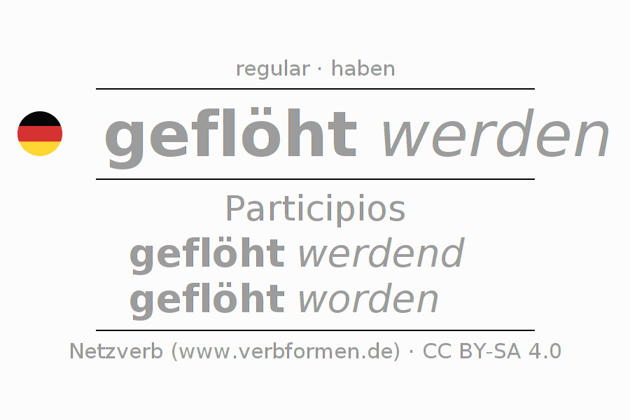 La conjugación de flöhen en Participio Presente Pasado perfecto palabra del habla Pasivo procesivo es geflöht werdend, geflöht worden.Para construir esta formas se requiere seguir algunas reglas gramaticales y también las especificaciones para la conjugación de verbos simples de flöhen en Participio . Comentarios ☆