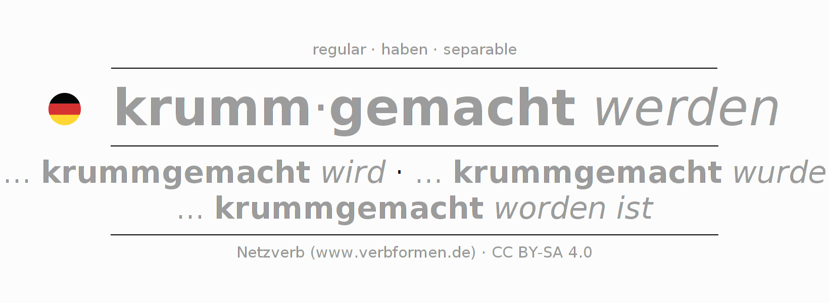 El verbo krummmachen, conjugado completamente en todas las personas y números gramaticales en Participio Presente Pasado perfecto.