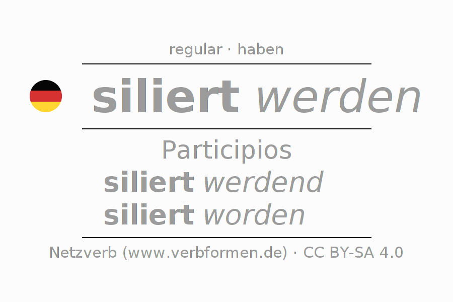 La conjugación de silieren en Participio Presente Pasado perfecto palabra del habla Pasivo procesivo es siliert werdend, siliert worden.Para construir esta formas se requiere seguir algunas reglas gramaticales y también las especificaciones para la conjugación de verbos simples de silieren en Participio . Comentarios ☆
