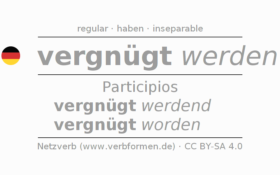 La conjugación de vergnügen en Participio Presente Pasado perfecto palabra del habla Pasivo procesivo es vergnügt werdend, vergnügt worden.Para construir esta formas se requiere seguir algunas reglas gramaticales y también las especificaciones para la conjugación de verbos simples de vergnügen en Participio . Comentarios ☆