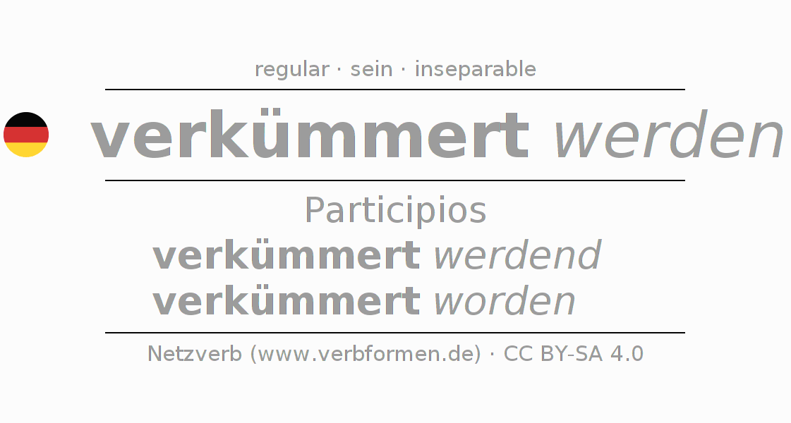 El verbo verkümmern, conjugado completamente en todas las personas y números gramaticales en Participio Presente Pasado perfecto.