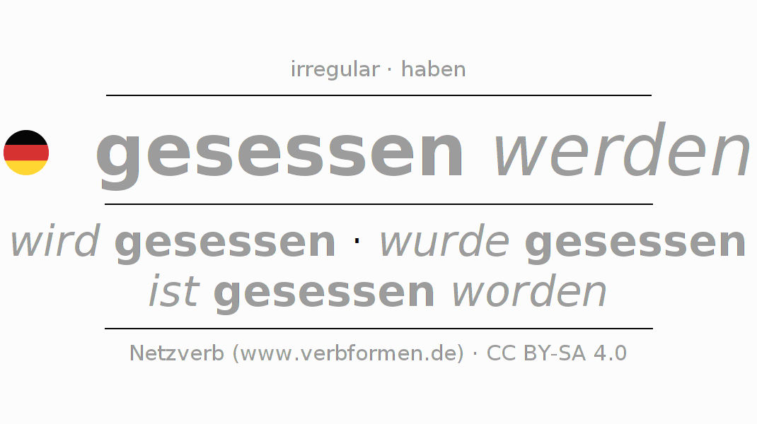 La conjugación de sitzen en Participio Presente Pasado perfecto palabra del habla Pasivo procesivo es gesessen werdend, gesessen worden.Para construir esta formas se requiere seguir algunas reglas gramaticales y también las especificaciones para la conjugación de verbos simples de sitzen en Participio . Comentarios ☆