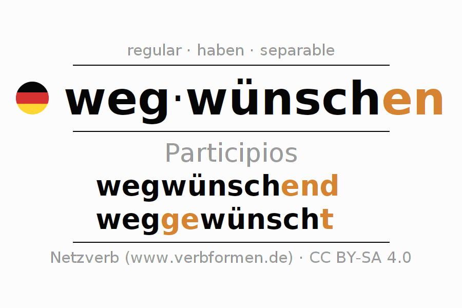 El verbo wegwünschen, conjugado completamente en todas las personas y números gramaticales en Participio Presente Pasado perfecto.