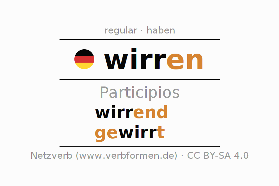 El verbo wirren, conjugado completamente en todas las personas y números gramaticales en Participio Presente Pasado perfecto.