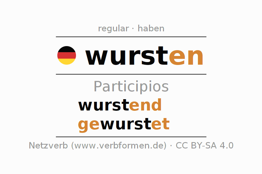 El verbo wursten, conjugado completamente en todas las personas y números gramaticales en Participio Presente Pasado perfecto.