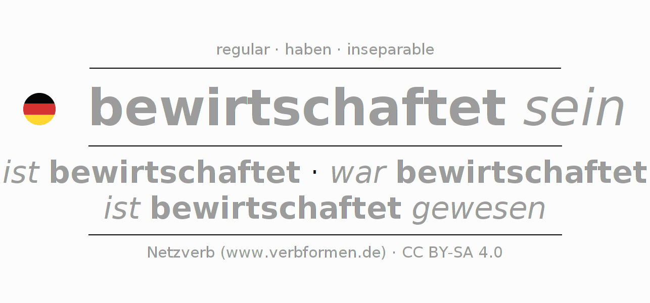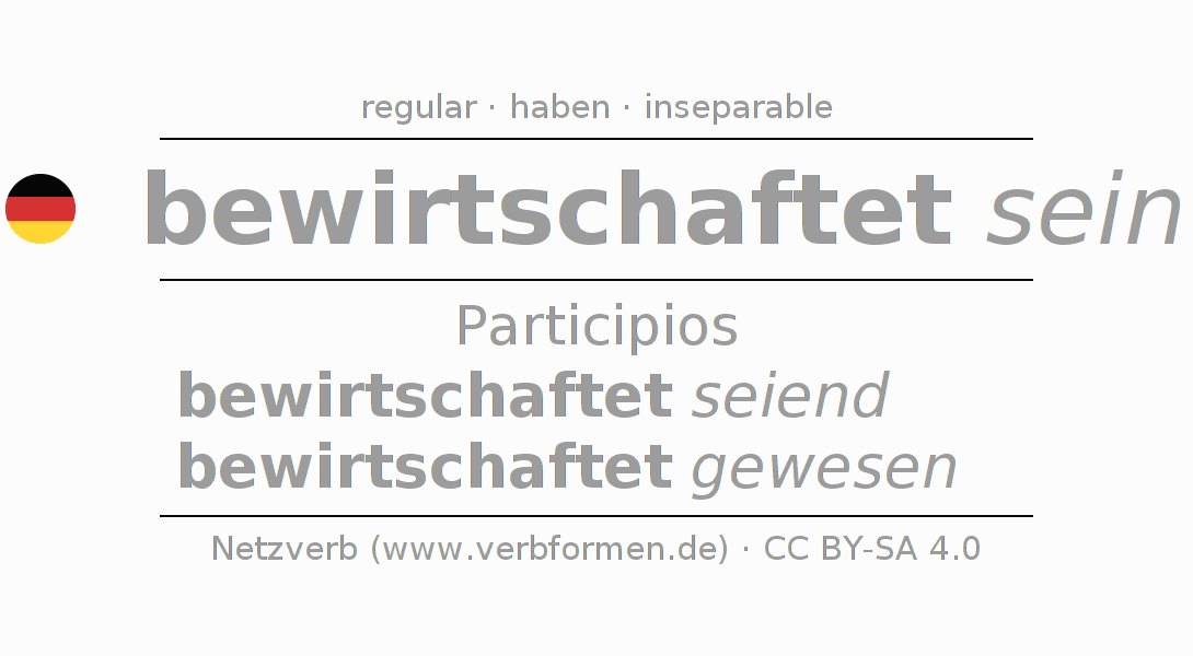El verbo bewirtschaften, conjugado completamente en todas las personas y números gramaticales en Participio Presente Pasado perfecto.
