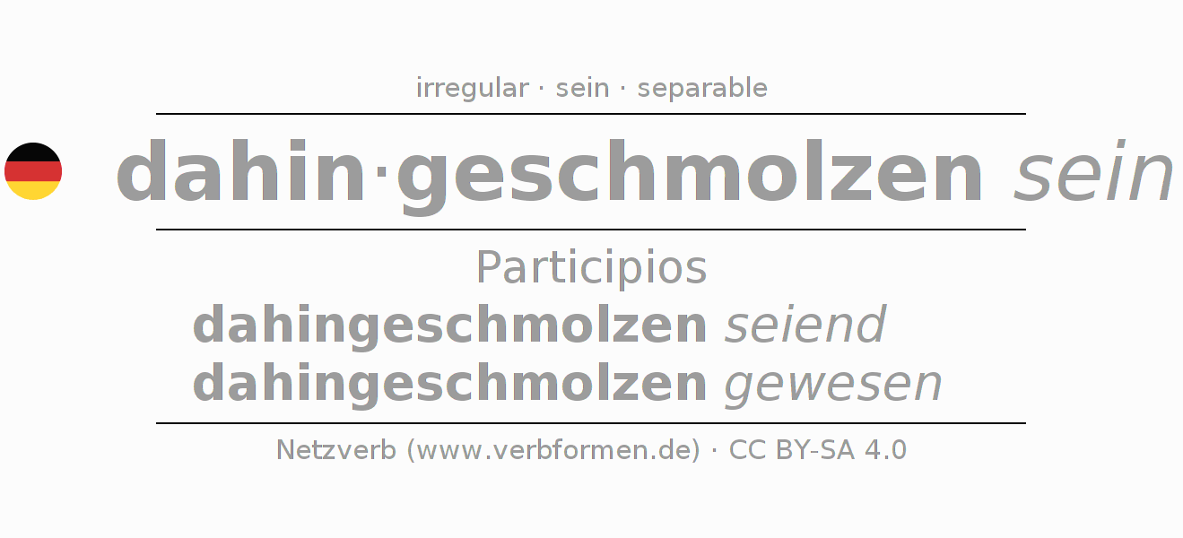 El verbo dahinschmelzen, conjugado completamente en todas las personas y números gramaticales en Participio Presente Pasado perfecto.