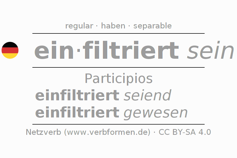 El verbo einfiltrieren, conjugado completamente en todas las personas y números gramaticales en Participio Presente Pasado perfecto.