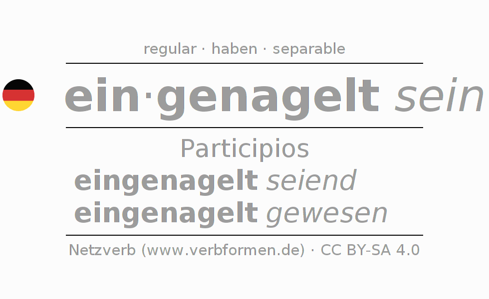 El verbo einnageln, conjugado completamente en todas las personas y números gramaticales en Participio Presente Pasado perfecto.