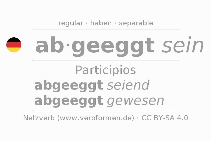 La conjugación de abeggen en Participio Presente Pasado perfecto palabra del habla Pasivo situativo es abgeeggt seiend, abgeeggt gewesen.Para construir esta formas se requiere seguir algunas reglas gramaticales y también las especificaciones para la conjugación de verbos simples de abeggen en Participio . Comentarios ☆