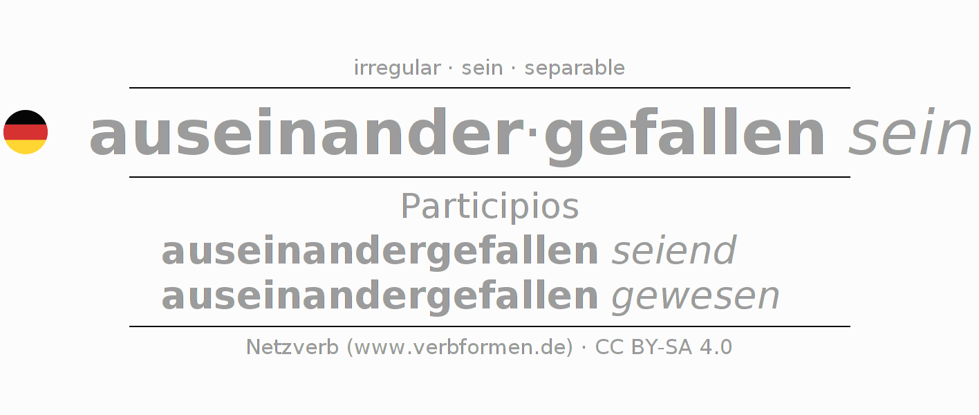 El verbo auseinanderfallen, conjugado completamente en todas las personas y números gramaticales en Participio Presente Pasado perfecto.