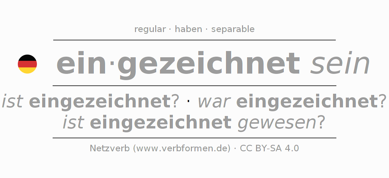 El verbo einzeichnen, conjugado completamente en todas las personas y números gramaticales en Participio Presente Pasado perfecto.