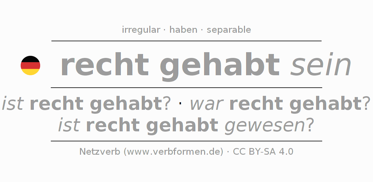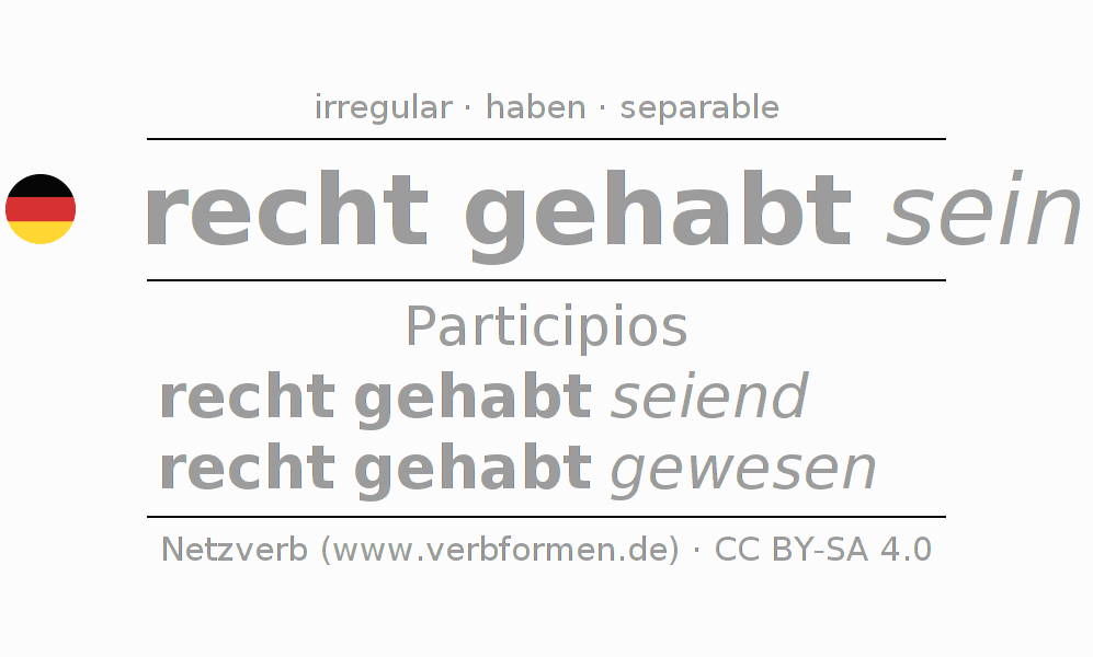 El verbo rechthaben, conjugado completamente en todas las personas y números gramaticales en Participio Presente Pasado perfecto.