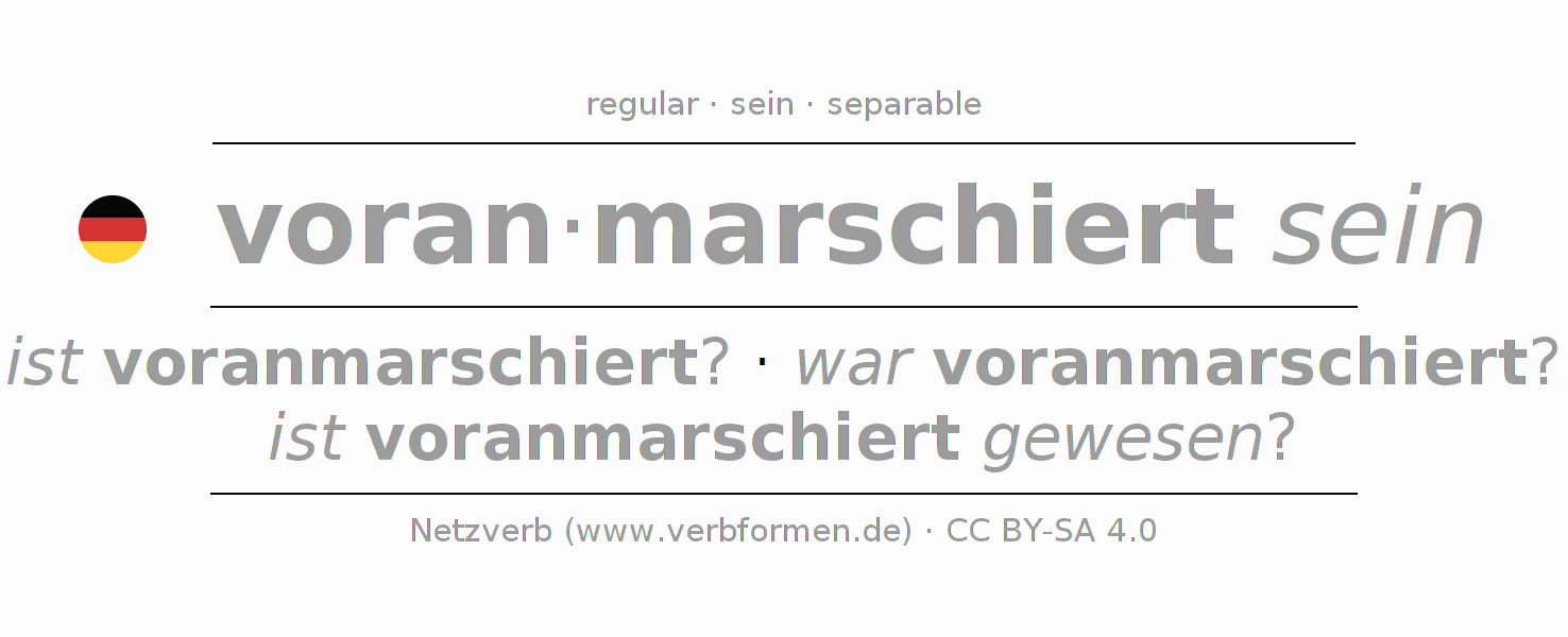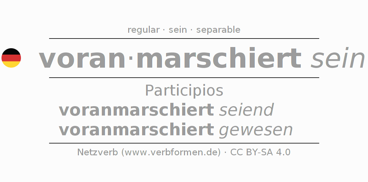 El verbo voranmarschieren, conjugado completamente en todas las personas y números gramaticales en Participio Presente Pasado perfecto.