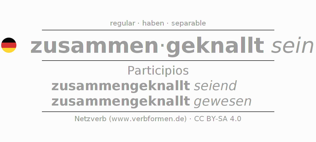 El verbo zusammenknallen (hat), conjugado completamente en todas las personas y números gramaticales en Participio Presente Pasado perfecto.