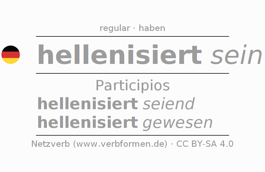 El verbo hellenisieren, conjugado completamente en todas las personas y números gramaticales en Participio Presente Pasado perfecto.
