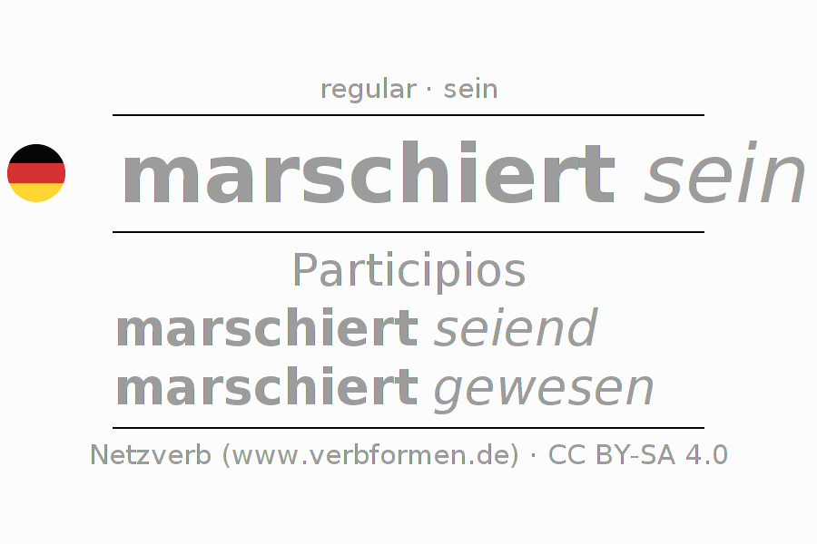 El verbo marschieren, conjugado completamente en todas las personas y números gramaticales en Participio Presente Pasado perfecto.