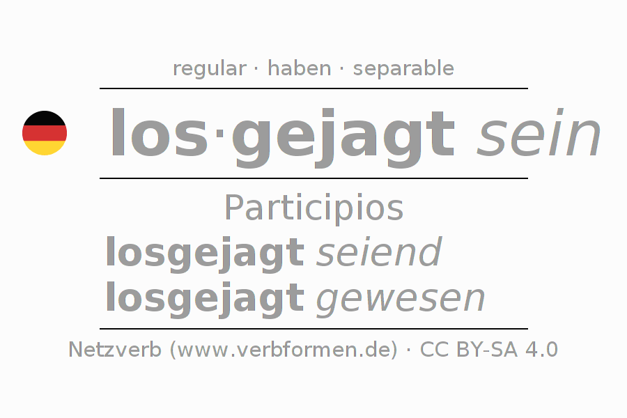 La conjugación de losjagen en Participio Presente Pasado perfecto palabra del habla Pasivo situativo es losgejagt seiend, losgejagt gewesen.Para construir esta formas se requiere seguir algunas reglas gramaticales y también las especificaciones para la conjugación de verbos simples de losjagen en Participio . Comentarios ☆