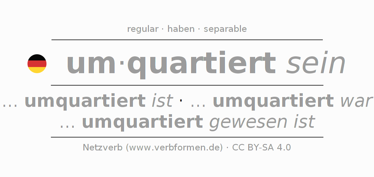 El verbo umquartieren, conjugado completamente en todas las personas y números gramaticales en Participio Presente Pasado perfecto.