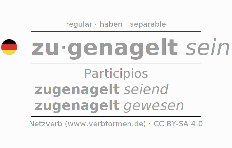 La conjugación de zunageln en Participio Presente Pasado perfecto palabra del habla Pasivo situativo es zugenagelt seiend, zugenagelt gewesen.Para construir esta formas se requiere seguir algunas reglas gramaticales y también las especificaciones para la conjugación de verbos simples de zunageln en Participio . Comentarios ☆